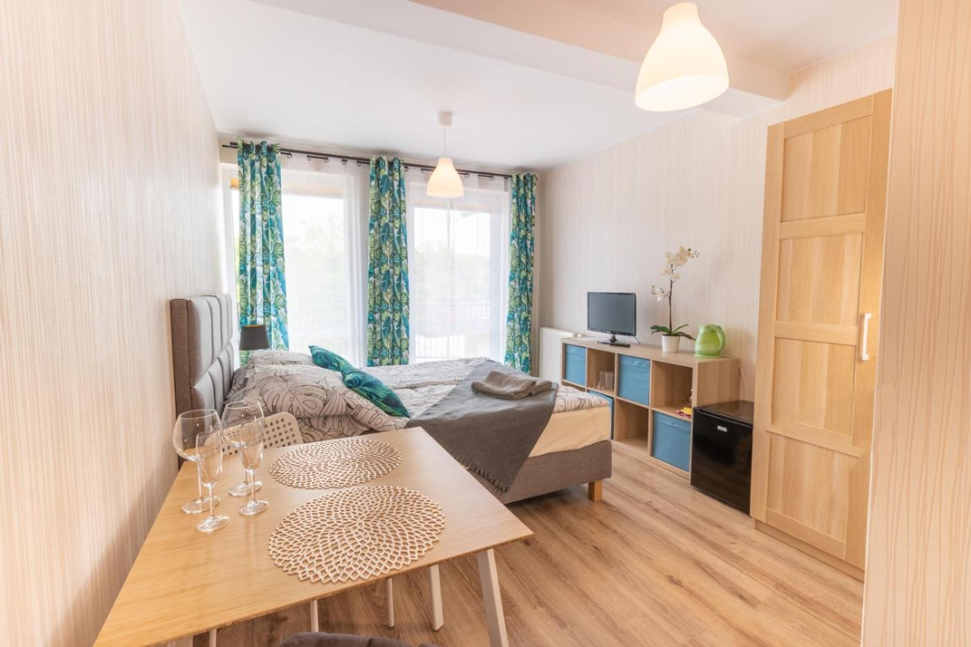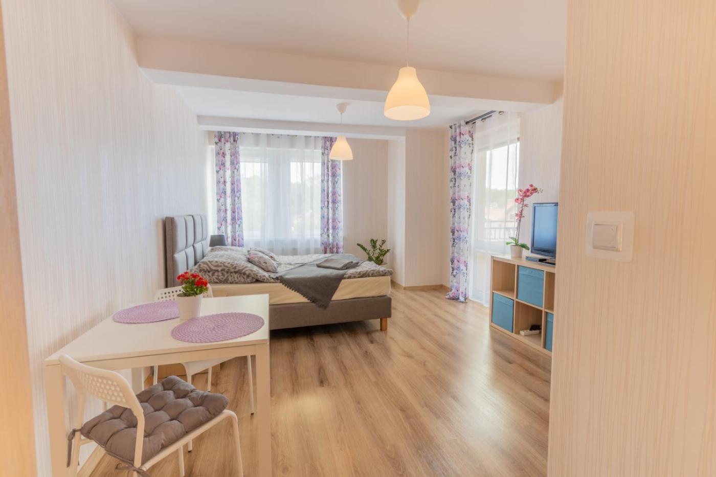 Apartament typu Suite z 2 sypialniami. This suite comprises 1 living room, 2 separate bedrooms and 1 bathroom with a shower. Guests can make meals in the kitchenette that comes with a stovetop, a refrigerator, kitchenware and an electric kettle. The suite provides a dining area, a wardrobe, heating, a flat-screen TV, as well as city views. The unit offers 4 beds. Apartament typu Suite - 4 osobowy. Powierzchnia pokoju ok.: 45 mkw. ;