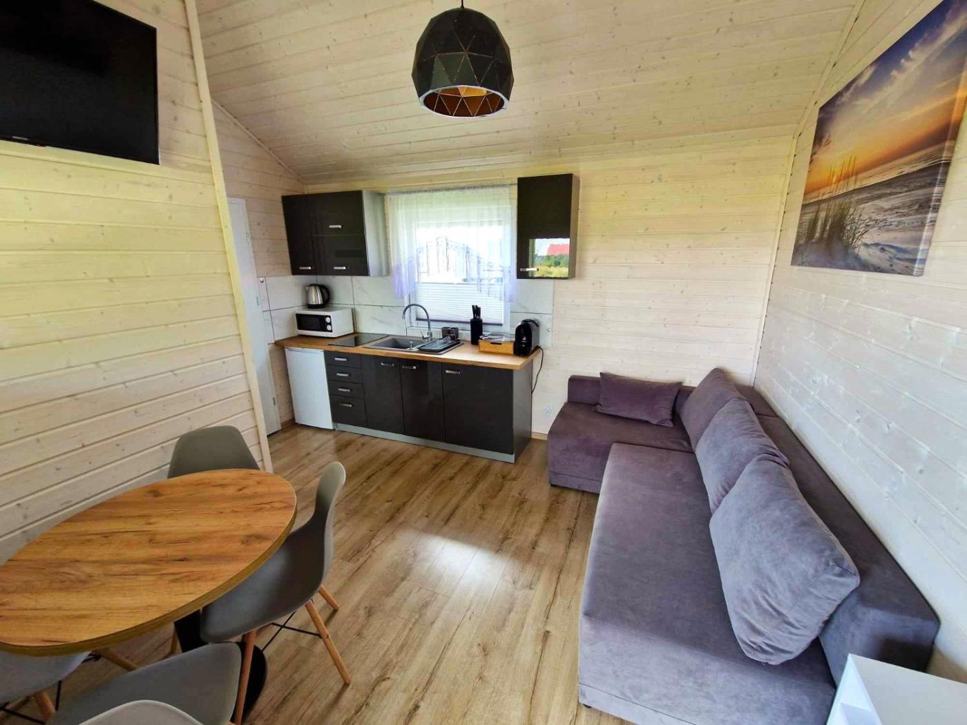 Domek. This chalets special feature is the fireplace. Boasting a private entrance, this chalet includes 1 living room, 1 separate bedroom and 1 bathroom with a shower and a hairdryer. Guests will find a stovetop, a refrigerator, kitchenware and a microwave in the kitchen. The chalet also features a barbecue. This chalet has a tea and coffee maker, a seating area, a flat-screen TV with cable channels and a terrace. The unit has 3 beds. Domek - 6 osobowy. Powierzchnia pokoju ok.: 30 mkw.